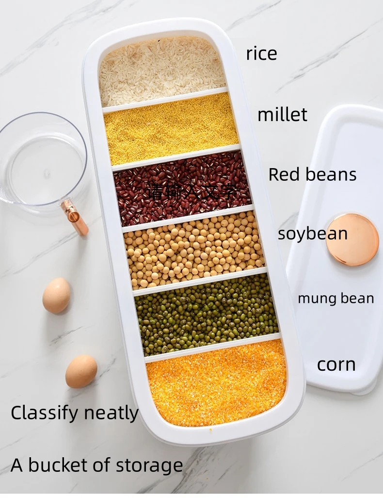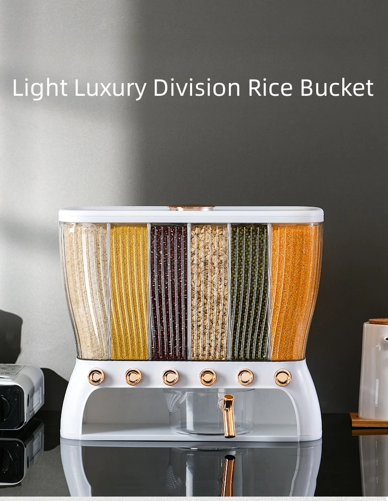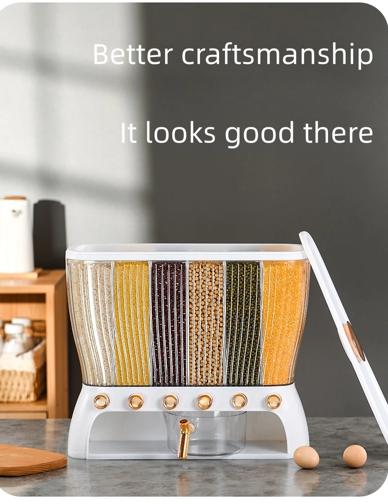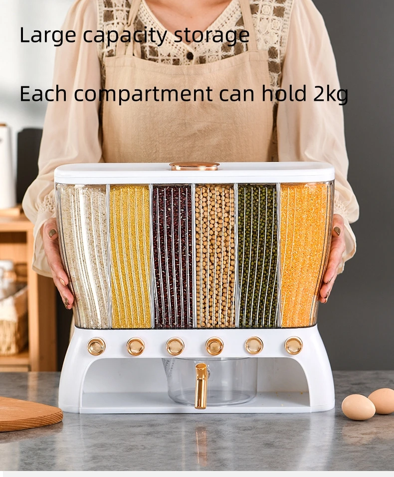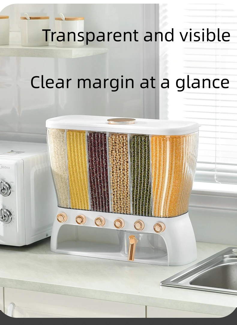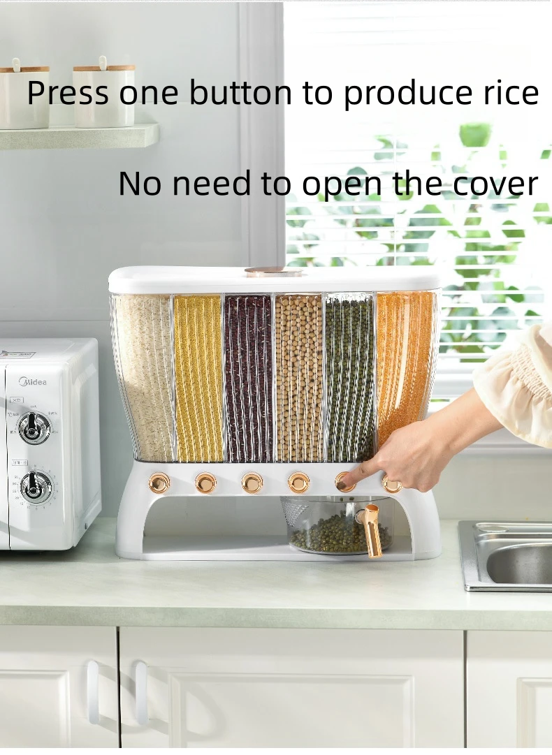 ✅ Rice dispenser 12kgs – This cereal dispenser it is suitable for, millet, green beans, soybeans, corn, rice, all kinds of lentils, etc. Rice container 12 kgs capacity for. It can store six grains (You can only put small grains, you can’t put large particles of candy, dried fruit, box cereal, pasta, etc., the hole below is relatively small, easy to get stuck)