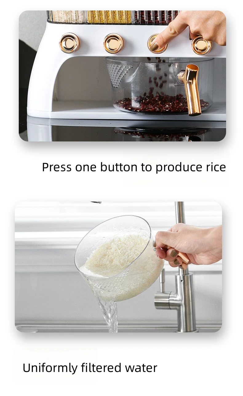 ✅ Rice dispenser countertop, With this grain storage dispenser you can quickly and easily quantify rice and whole grain by gently pressing the button without opening and closing the lid, with visible transparent scale window, you can observe reserves in real time.