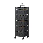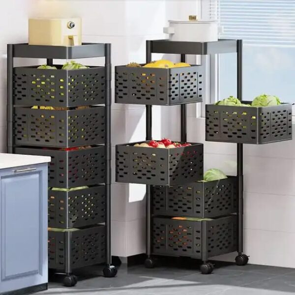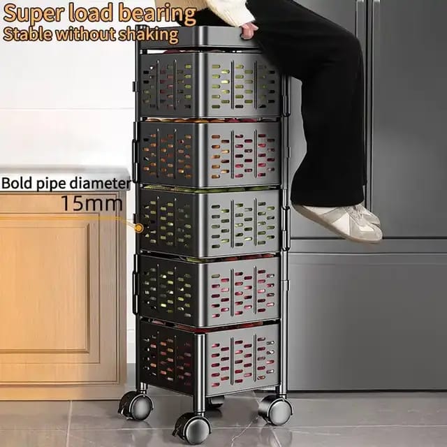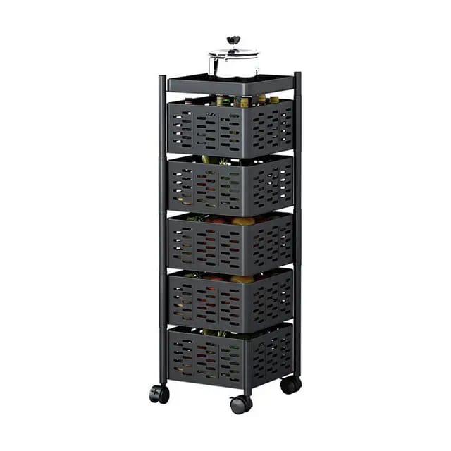 5 Layer Square Vegetable Fruits Rotating Rack With Wheels Uniquely rotating multipurpose can be use in the kitchen, dinning and living room For storage of vegetables and fruits, snacks, books etc Movable with wheels and utilizes space Light weight and can be placed on any convenient surface Can easily be cleaned Durable and strong metallic material