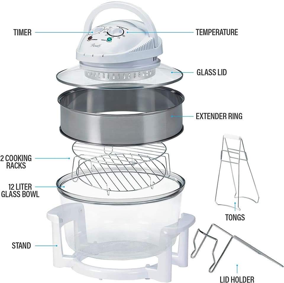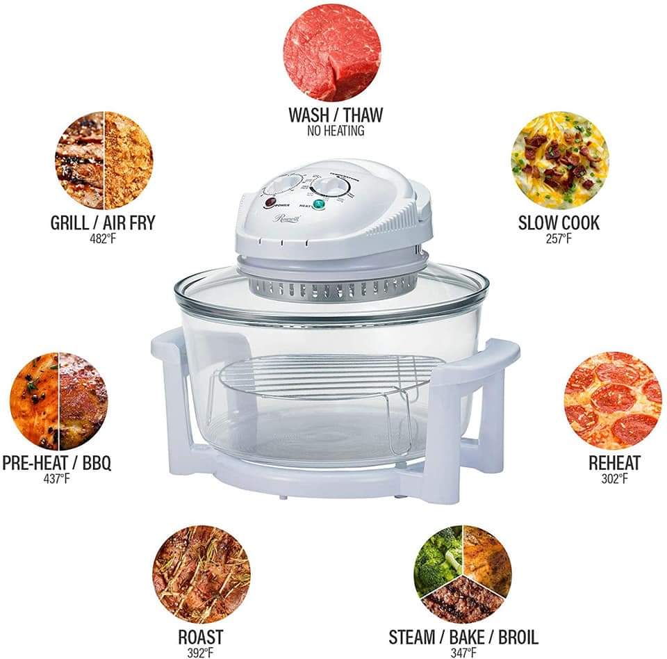 1. The halogen oven is a necessity in every woman’s kitchen. It helps to grill, Broils, defrost, steams and stir fry chicken, turkey, fish, corn, potato etc… The halogen oven is easy to operate that has turbo pot like that has a stand for your food to be placed on. And the cover is operational where the off and on is location inclusive and the degree temperatures is indicated.